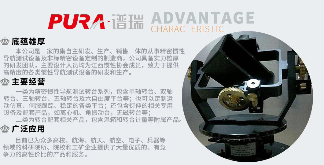 公司主要優(yōu)勢在精密加工、精密測量、精密設(shè)備。公司產(chǎn)品主要為精密慣性導(dǎo)航測試轉(zhuǎn)臺系列,包含單軸轉(zhuǎn)臺、雙軸轉(zhuǎn)臺、三軸轉(zhuǎn)臺、五軸轉(zhuǎn)臺及六自由度平臺等;也可以定制運(yùn)動仿真、伺服跟蹤、穩(wěn)定的各類平臺。目前已為眾多高校、航海、航天、航空、電子、兵器等領(lǐng)域的科研院所、院校和工礦企業(yè)提供了大量的、有競爭力的高性價比的產(chǎn)品和服務(wù)。